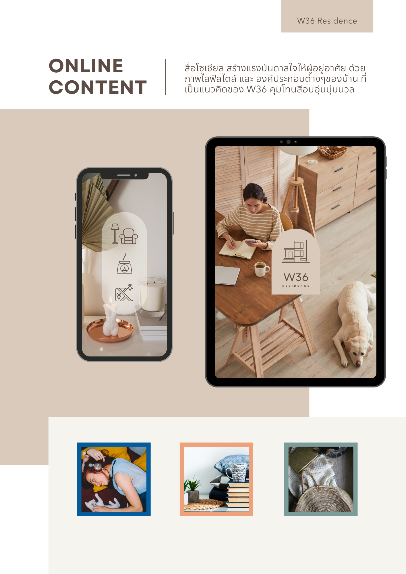 To reflect the charm of W36 residence, we have created a minimalist geometric theme with clean lines, simple forms, and warm colors that preserve a modern feel. Our primary color palette includes muted shades of brown with a hint of blue, providing a soothing and vibrant contrast for our accents